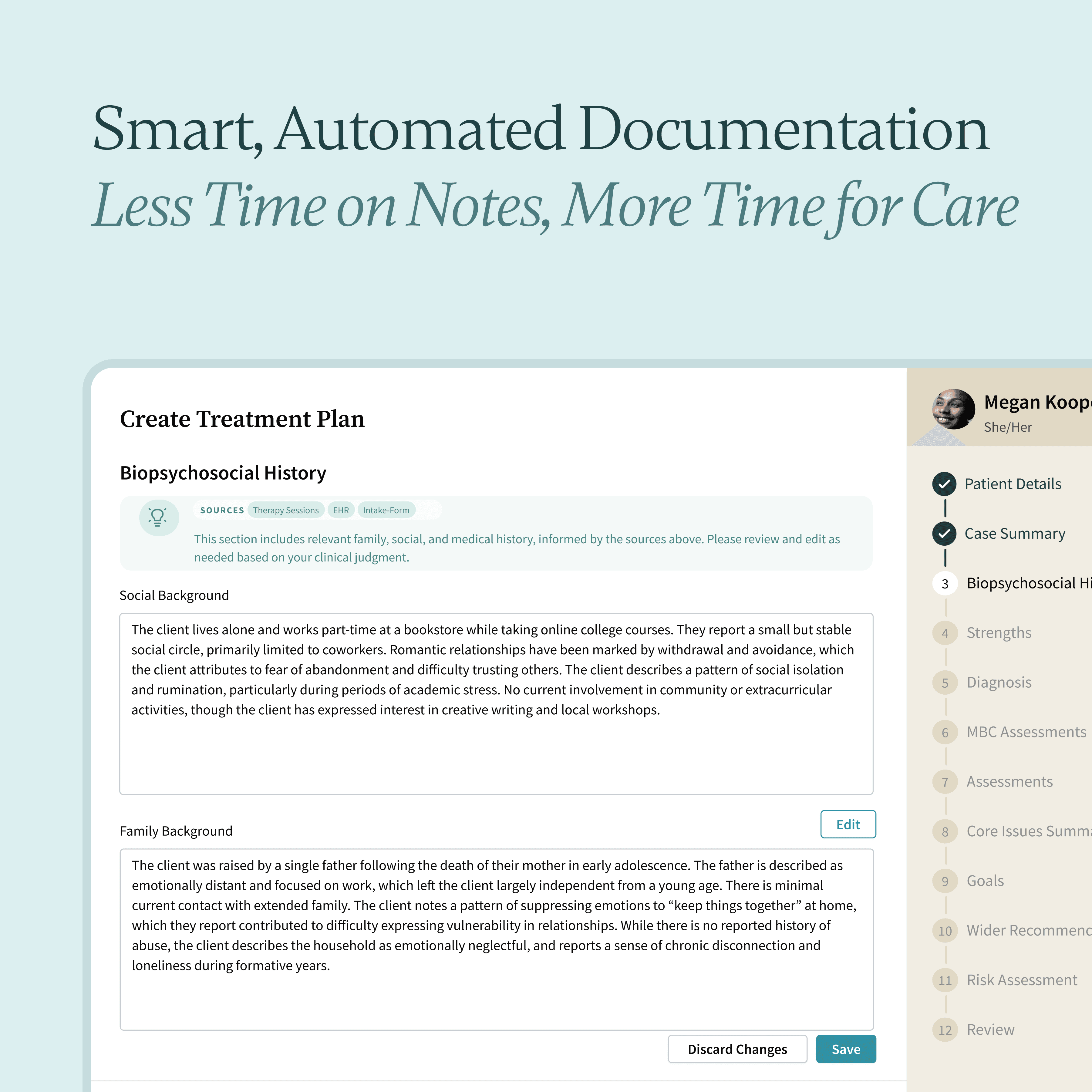 Intelligent Documentation – AI-powered notes and treatment plans help you stay thorough, compliant, and organized.