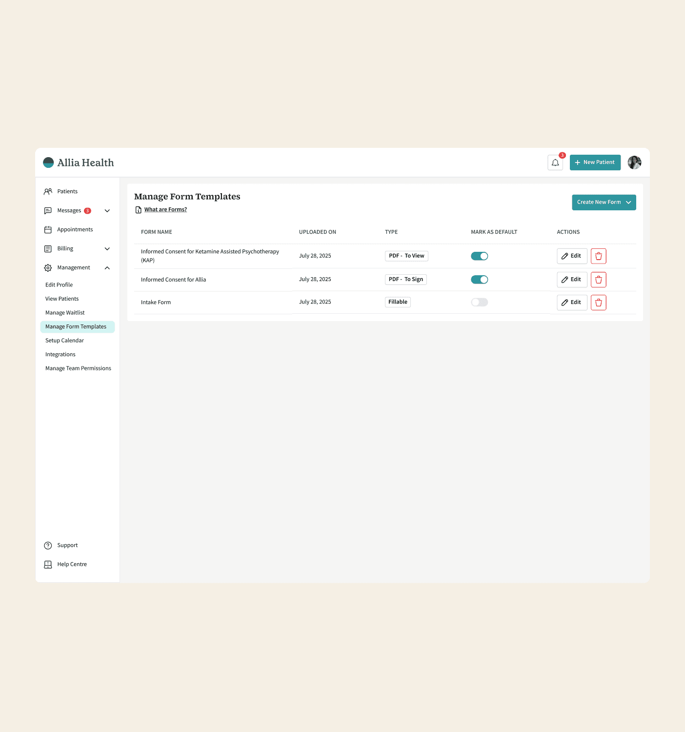 Allia’s system makes the intake experience easy every time. Use a pre-built form, create your own, or borrow from peers – every intake automatically updates your client dashboard and informs your treatment plans. Mobile-friendly forms, built-in reminders, and instant confirmations keep everyone on track from the very first session.